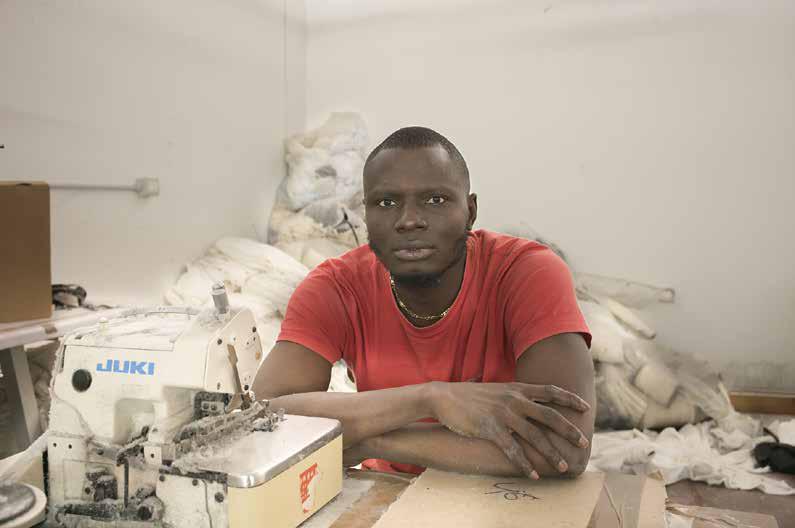 Ici ? Un atelier dans une rue du centre de Prato, à trente kilomètres de Florence. L’air est lourd d’un brouillard de particules de fibres synthétiques. Cette suffocante poussière s’infiltre et s’incruste partout. Il y a deux semaines, tout l’espace était encombré de postes de travail équipés de machines à coudre Juki. «Il n’y en a pas de meilleures dans le monde, surtout pour le genre de travail que l’on faisait ici.» L’étincelle d’orgueil qui brille dans les yeux de Talla Diazine, quand il évoque la machine sur laquelle il était si habile, si rapide, si productif, s’éteint bien vite. La Juki, c’est l’outil