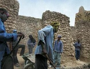 Fig. 18. L’adobe (argile mélangée a de l’eau et très peu de paille) utilisé pour la construction de la mosquée est particulièrement fragile. Cela oblige les habitants a de continuels travaux d’entretien, qui sont devenus un acte de dévotion auquel chaque homme se sent contraint de sacrifier.