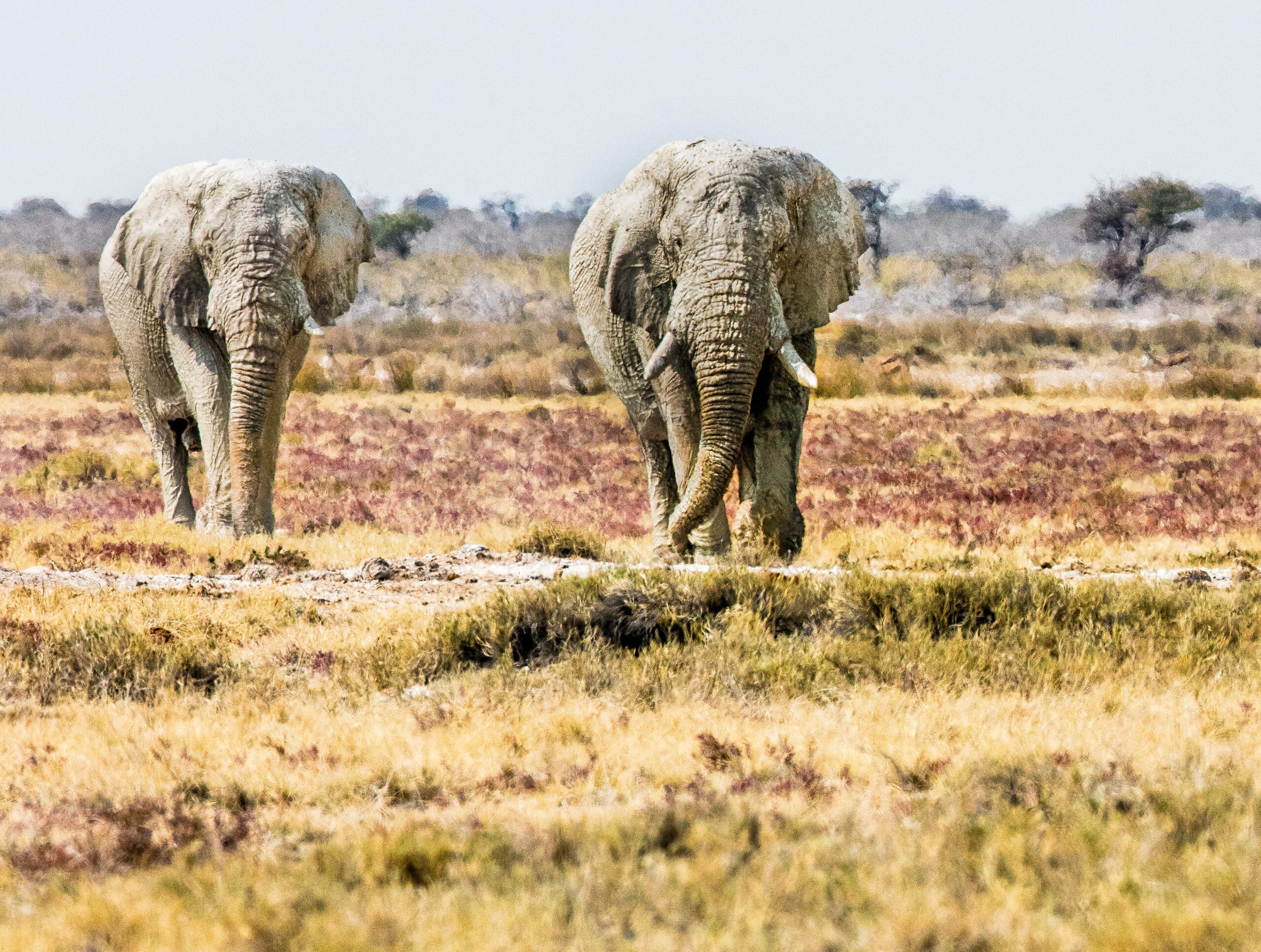 Couple d’éléphants dans la réserve d’Etosha Namibie en période de grande sécheresse.
